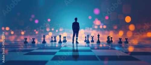 A contemplative figure stands before a chessboard, surrounded by illuminated chess pieces, symbolizing strategy, intellect, and decision-making.
