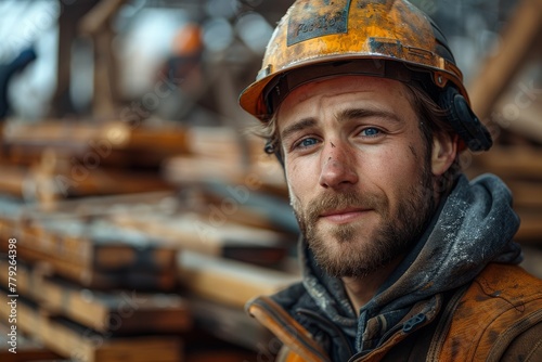 A contemplative male builder in a hardhat and high-vis jacket reflects amid the construction site