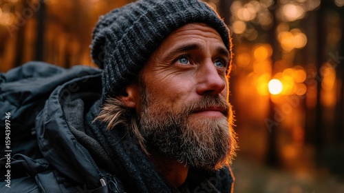 A contemplative man in nature during sunset.