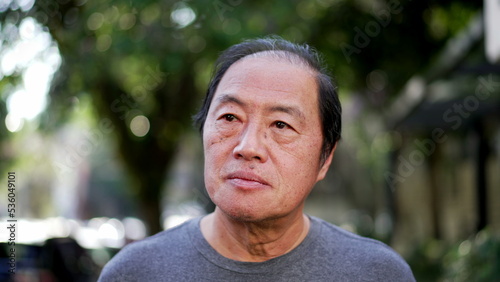 A contemplative middle aged Asian man walking outside in sunlight being mindful. Portrait of a thoughtful senior person in city street