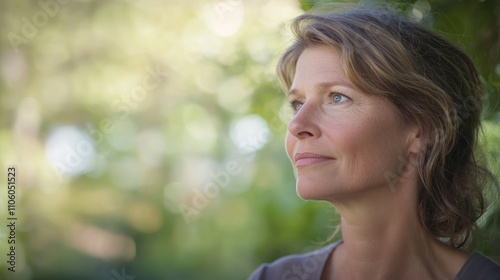 A contemplative portrait of a woman gazing away from the camera, deep in thought against a blurred background