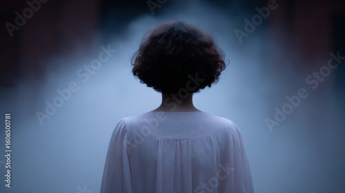 A contemplative silhouette of an Asian woman enveloped in misty twilight evokes Hanami and Dia de Muertos reflections