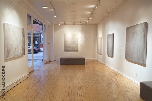 A contemporary art gallery with sleek wooden floors, minimalist white walls, and modern art pieces perfectly lit by soft overhead lighting.