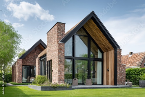 A contemporary brick house features expansive windows and charming wooden accents, nestled within a vibrant green garden under a clear, sunny sky