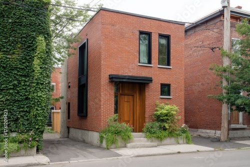 A contemporary brick house stands proudly within an urban neighborhood, surrounded by lush greenery, beautifully highlighting its modern architecture and design amidst the daylight
