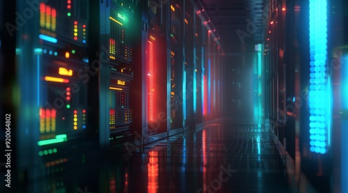 A contemporary data center that features striking vibrant neon lights and an impressively sleek, reflective floor