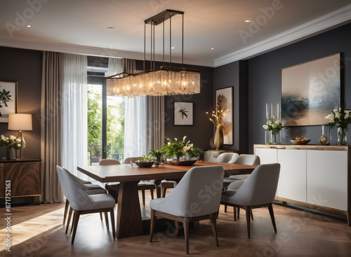 A contemporary dining room with a rectangular table, upholstered chairs, and a statement light fixture.