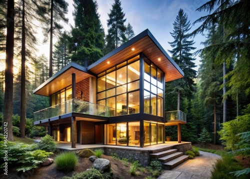 A Contemporary House Made Of Glass And Wood Nestled Amidst Towering Evergreen Trees In A Tranquil Forest Setting.