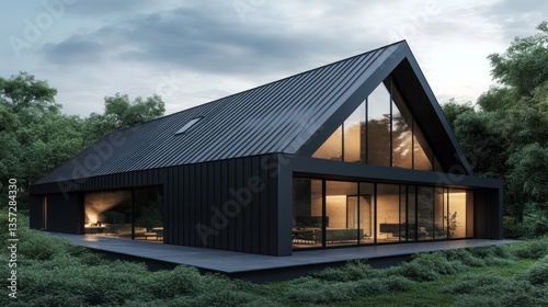 A contemporary house with a sleek black roof made of matte metal panels, expansive glass windows framing the interior, and surrounded by a lush green landscape