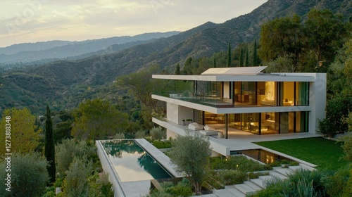 A contemporary house with clean solar panels installed on the rooftop, sustainable architecture.