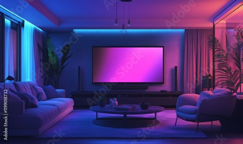 A contemporary living room featuring a large TV, the interior design of a modern home theater in a luxurious house at night, with a luxury sofa, armchair, and coffee table.