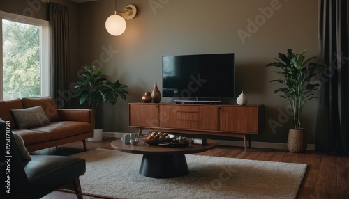 A contemporary living room with a mid-century modern design, showcasing a sofa, abstract artwork, and cozy lighting from a floor lamp and windows