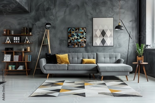 A contemporary minimalist living room with a low-slung grey couch, a minimalist bookshelf, and a geometric rug." Camera: Canon EOS 5D Mark IV --ar 3:2 Job ID: 01f57ef9-d946-488f-8eab-96bed58c5db2