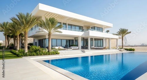 A contemporary modern white villa with large windows, surrounded by palm trees and an infinity clear swimming pool in front. The style is high luxury with detailed architecture and modern furnishings.