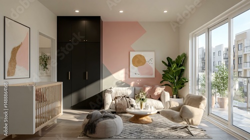 A contemporary nursery with a sleek black wardrobe, pastel accent wall, geometric patterned rug, and a clean white crib bathed in soft daylight, no text
