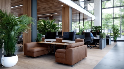 A contemporary open office design featuring large windows, lush plant decor, and comfortable seating, creating a bright and collaborative workspace environment.