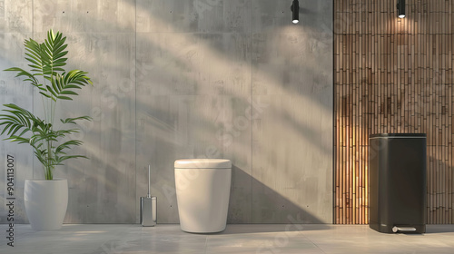 A contemporary restroom with a white toilet bowl, a minimalist black bin, a bamboo folding screen,