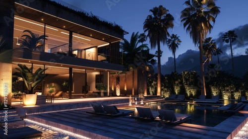 A contemporary villa at night with glowing windows, a spacious deck with an outdoor dining area