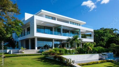 A contemporary white villa, bathed in sunlight, its large windows gleaming as they reflect the azure sky,