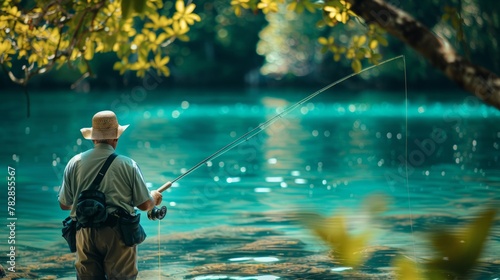 A contented fisherman casts a line into tranquil waters