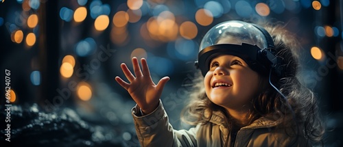 A contented young girl using a virtual reality headset touches a screen. Idea of cutting-edge technology..
