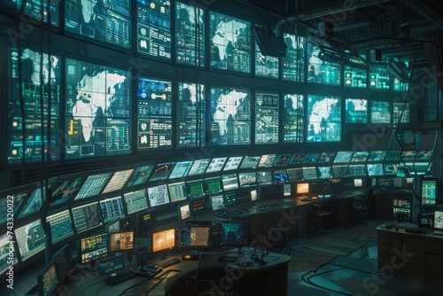A control room filled with screens showing graphical data, maps, and texts, with ambient lighting and no visible people.