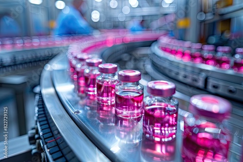 A conveyor belt with many pink bottles on it