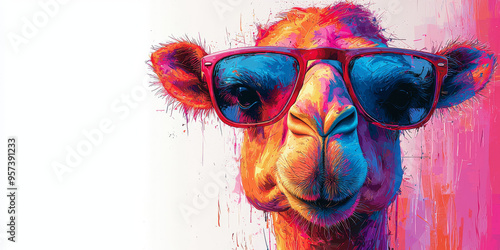 A cool camel with sunglasses sporting a vibrant, colorful look.
