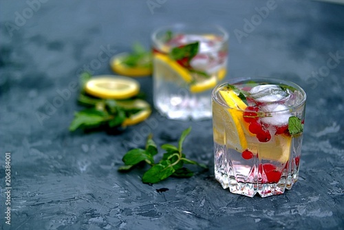 A cool drink, sparkling water with lemon, red currant, mint and ice in glasses on a dark gray concrete background