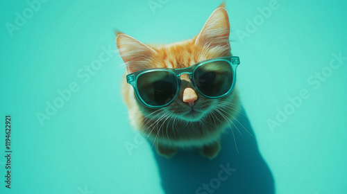 A cool, stylish orange cat wearing teal sunglasses poses against a vibrant turquoise background, exuding a playful and relaxed vibe that captures attention.