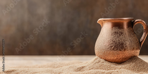 A copper jug sits partially buried in a soft mound of sand. Rustic charm, simplicity, warmth