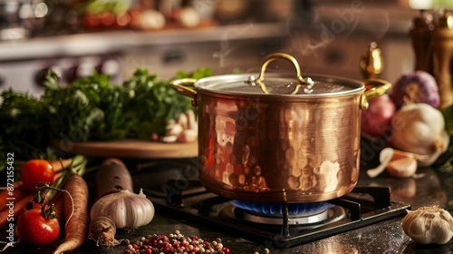 A copper pot simmering on a stove, surrounded by fresh vegetables and spices