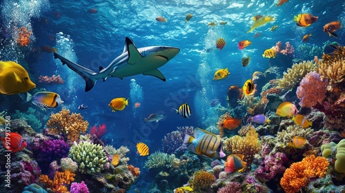 A coral reef filled with vibrant tropical fish, with a shark adding a touch of excitement to the underwater landscape.