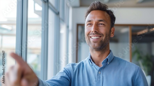 A corporate executive is smiling and enthusiastically pointing towards a window in a bright office setting. He appears to be engaged in meaningful discussion with colleagues