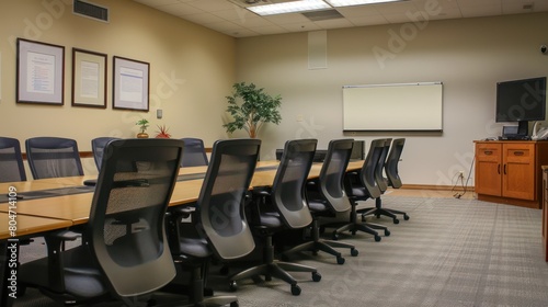 A corporate meeting room boasting a large table, rolling chairs, a whiteboard, and a TV