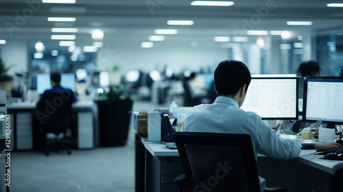 a corporate office environment, viewed across a large, open floor plan. Numerous employees are seated at their desks, deeply focused on their computer screens, indicative of a typical busy working day