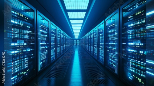 A corridor of server racks in a futuristic data center illuminated by blue neon lights, symbolizing high-speed data processing.
