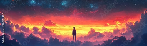 A cosmic adventure scene with a lone figure walking towards a vibrant galaxy of stars and nebulae.