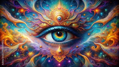 A cosmic eye surrounded by swirling nebulae and celestial bodies, a dazzling spectacle of vibrant colors and intricate patterns.