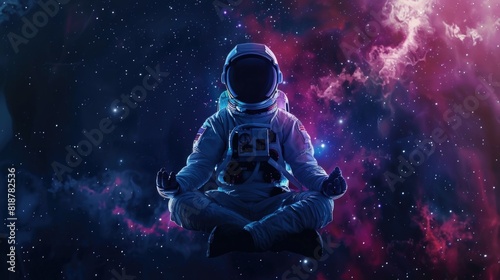 A cosmic meditation of an astronaut sitting in the lotus position in the middle of dark space. Spiritual esoteric mood