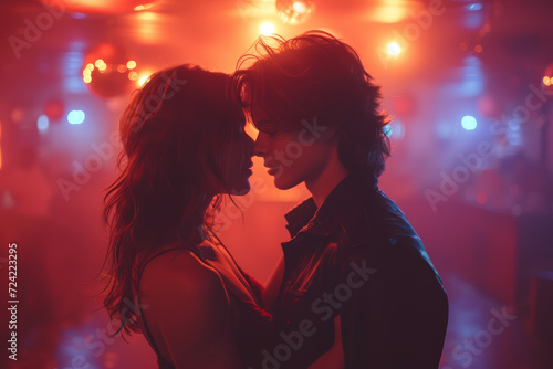 A couple dancing under a dimly lit disco ball, capturing the groovy atmosphere of a 70s-themed party. Concept of disco fever. Generative Ai.