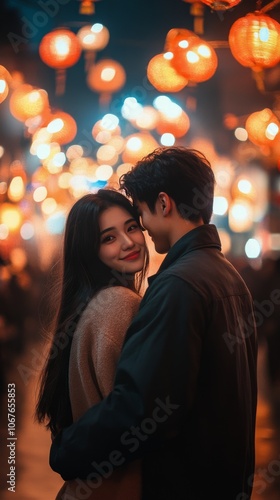 A couple embraces during a vibrant fireworks display in a lively city at night