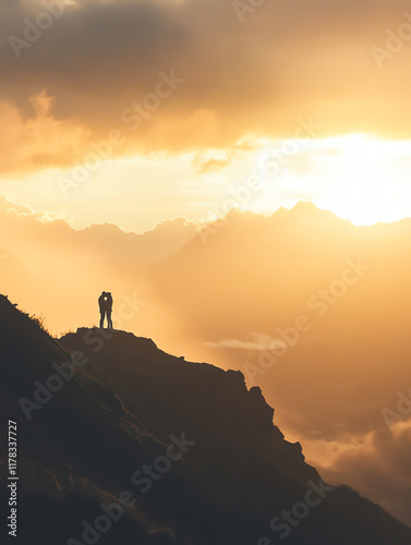 A couple embracing at sunset on a mountain, surrounded by majestic nature and a serene atmosphere.