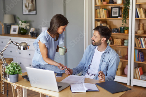 A couple engaged in conversation at a home office, the woman handing a coffee cup to the man, who is reviewing documents on his laptop. Bookshelves and plants add a warm touch.