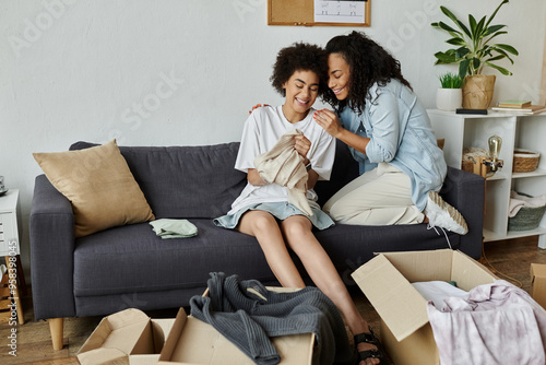 A couple enjoys creative clothing upcycling in their stylish home space.