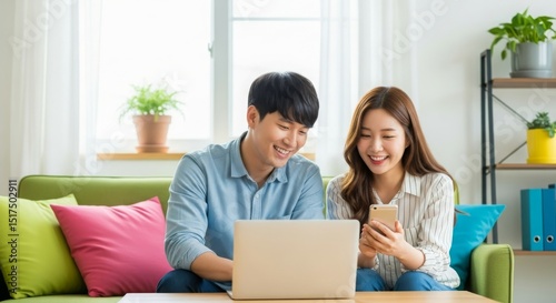 A couple enjoys technology together, smiling while using a laptop and smartphone.