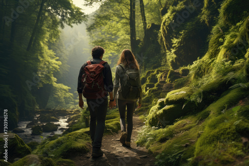 A couple hiking in a lush forest, showcasing the beauty of nature and shared adventures. Generative Ai.