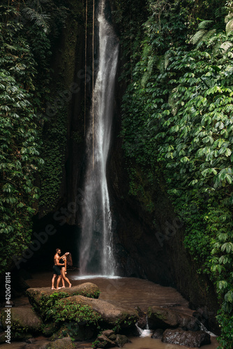 A couple in love on a waterfall. Honeymoon trip. Happy couple on the island of Bali. Beautiful couple travels the world. Travel to Indonesia. Happy couple on vacation. Wedding trip. Copy space