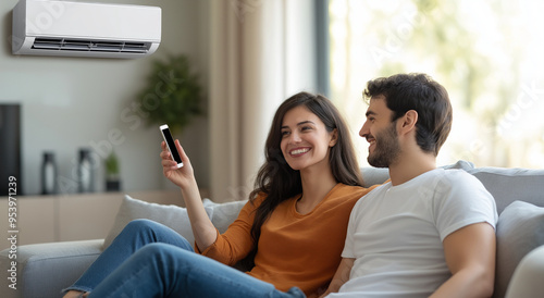 A couple is sitting on a couch, a woman is holding a phone, and there's an air conditioner on the wall.