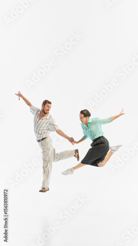 A couple joyfully performs an energetic retro dance leap in mid-air against a white background. Concept of vintage dance enthusiasm and dynamic couple synergy.